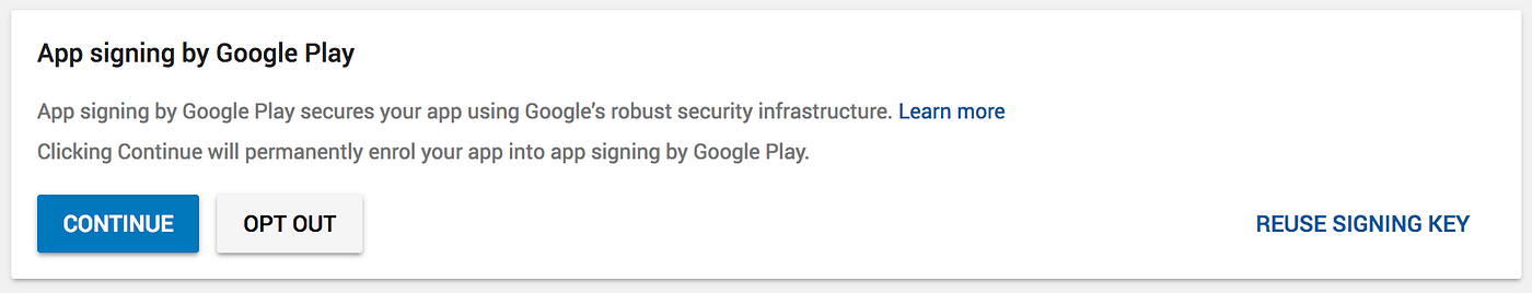However, yous also have the choice to reuse a signing key — this ways that the Signing Cardinal used past Google Play for another projection of yours can also be used for this new project that you're creating. This can however pose a security risk as if for whatever reason your business relationship become compromised, then all of your applications that depend on the compromised central could be at hazard.